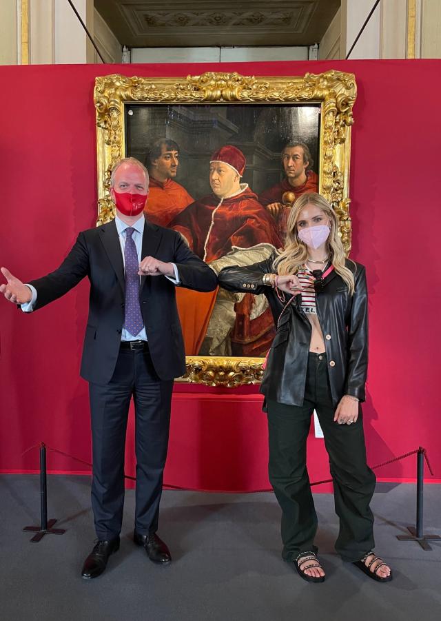 C'è poi stato un momento nel luogo dove è nata il pret-a-porter, la Sala Bianca, ed una sosta finale sulla terrazza affacciata sulla bellissima veduta del cuore della culla del Rinascimento. In particolare, l'imprenditrice digitale ha ammirato il grande affresco di Giovanni di San Giovanni (Tesoro dei Granduchi) e, in Palatina, i capolavori di Raffaello come la Madonna della Seggiola e La Velata; Chiara Ferragni si è poi scattata un selfie di fronte alla Venere italica di Canova, sempre in Palatina, e concessa una foto insieme ad Eike Schmidt, davanti al famosissimo ritratto di Leone X di Raffaello.