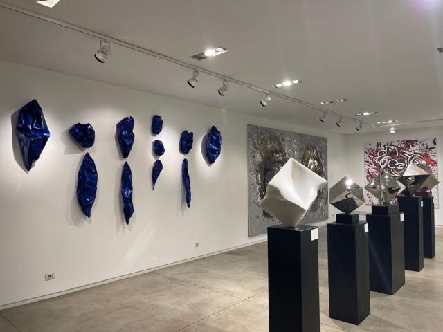 "Queste sculture sono ispirate in realtà allo spazio cosmico- continua Lorenzelli- questa che vediamo che si chiama Blue Fractalis è come se fosse un’esplosione di meteoriti, una scultura modulare con questi moduli che sono composti che si possono allargare, separare, sono leggerissimi e sono fissati alle pareti da dei magneti. Sulle pareti ho messo del ferro adesivo e la scultura viene fissata in questo modo e quindi dà proprio l’idea dell’esplosione nello spazio. Poi le le atre opere che creo sono sempre legate ai pianeti per esempio, oppure al pianeta Terra e quindi i mari e i laghi, la Terra è chiamato il pianeta blu e quindi al colore blu, i materiali che utilizzo sono differenti di diverse colorazioni e l’ultimo questo blu cobalto è un blu che ancora viene creato con gli ossidi di alluminio quindi siamo sempre in tema”