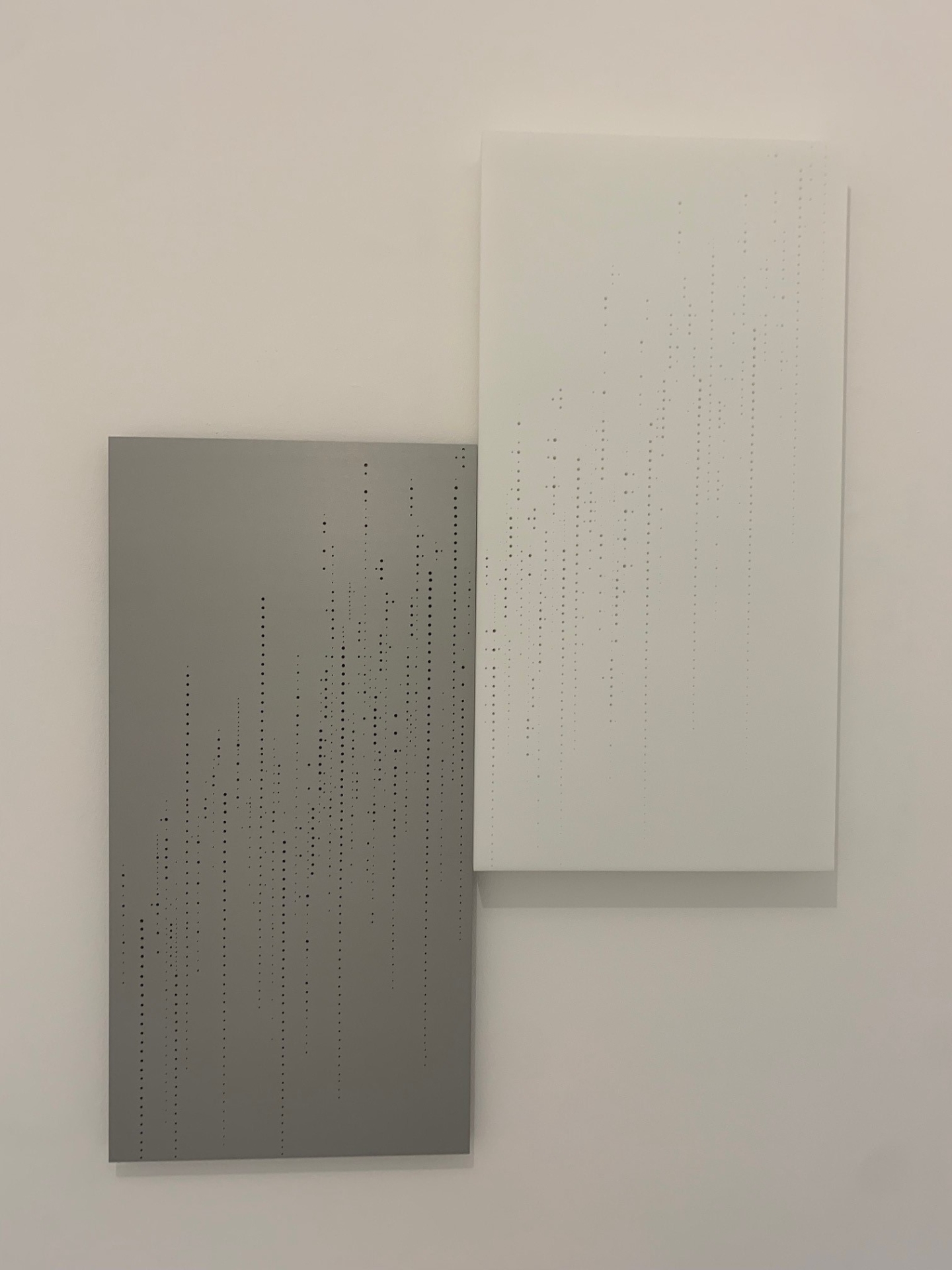 “Ritmi e partiture possono essere definite anche le opere di Riccardo De Marchi, che lavora sulla corporeità della traccia, attraverso le sue sequenze di buchi che dichiarano le proprie parti mancanti.” De Marchi usa i buchi come in un alfabeto che segue delle traiettorie, che suggerisce un’idea di scrittura, il vuoto fisico in un ritmo sincopato non regolare diventa la pienezza dell’immagine, la fisicità dell’opera.