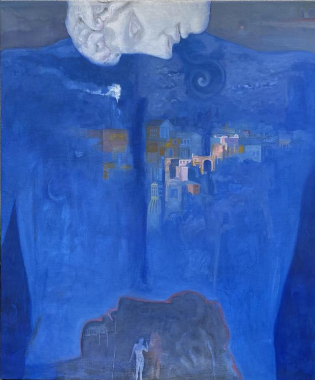La mostra del MANN, patrocinata dalla Fondazione Banco di Napoli e sponsorizzata dalla Fondazione Plart, raccoglie dodici tele, accostate ad un'installazione lignea intarsiata (non casuale il titolo: dodici facce) e a tre panche che riproducono le suggestioni tratte dalla figura scultorea. Adone diviene creatura surreale e, in un certo senso, legata alla dimensione urbana: nei quadri, in cui sono predominanti i colori da sogno dell'azzurro e del blu sfumato, il giovane è profilo protettivo che sorvola e osserva la città, in pose che riecheggiano la fantasia di Marc Chagall (tela "La distanza); è ponte fra passato e presente come suggerisce il suo busto tagliato in una raffigurazione; si trasforma in creatura antropomorfa come custode di una memoria antica. Al visitatore il compito di andare a caccia di simboli, perdendosi nelle due sale della mostra (94 e 95, accanto al Plastico di Pompei): con resa calligrafica, infatti, Di Riso non si discosta mai dall'originale scultoreo, sempre ben riconoscibile per quanto trasfigurato. La scommessa dell'artista è suggerire un percorso altro, che non rifugge dalle citazioni dotte, come nel caso delle tele "Divina Commedia" e "Villa dei Misteri".
