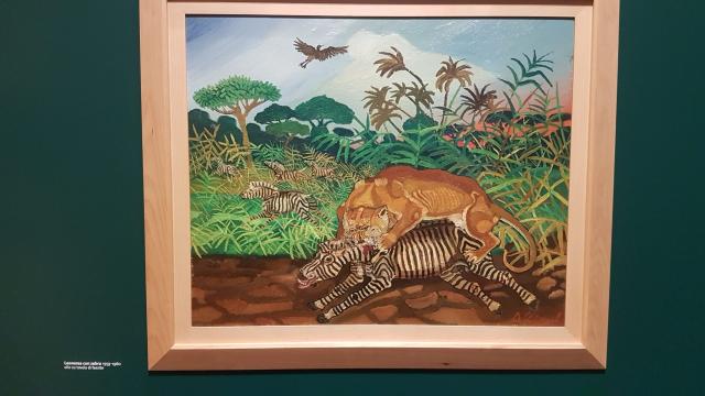 Antonio Ligabue, vero ‘espressionista tragico’, artista straniero al mondo, che de “l’ora senz’ombra”, quando classicamente le tragedie vengono recitate, restituisce fiamme di vita, scene fantastiche di umanità dirompente, ferina, abbagliante, drammaticamente vivace.