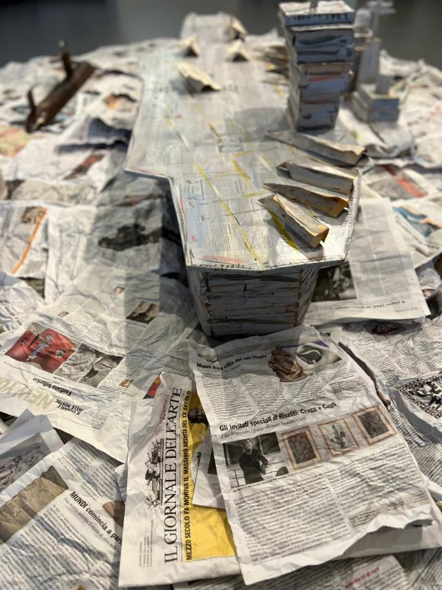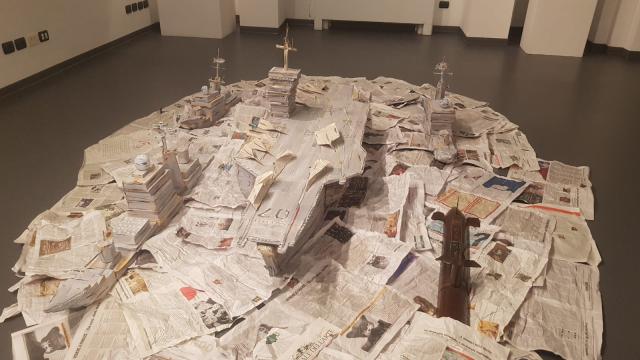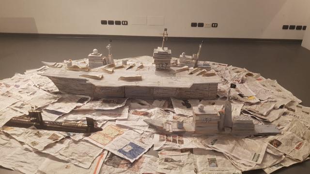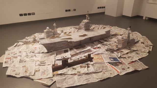 L’artista ha poi creato per l’Acquario un’altra installazione, La flotta dell’arte. Dall’immaginario Cantiere Navale Bonomi provengono portaerei e sottomarini realizzati impilando libri, cataloghi, enciclopedie (I maestri del colore) e riviste quali Il Giornale dell’Arte. E’ evidente la polemica verso il sistema dell’arte dove pile di carta diventano materiale di costruzione rendendo il contenuto del tutto irrilevante.