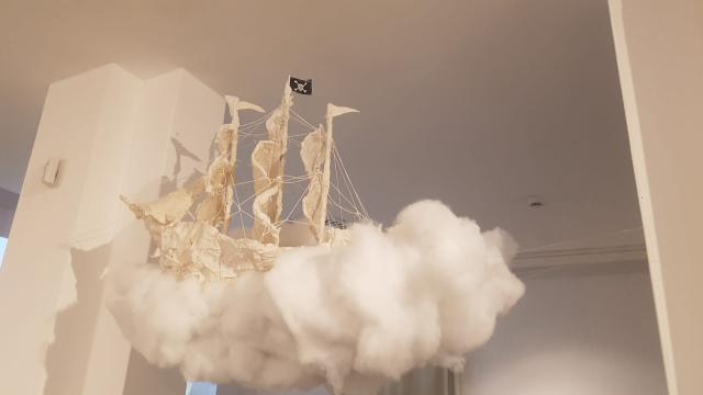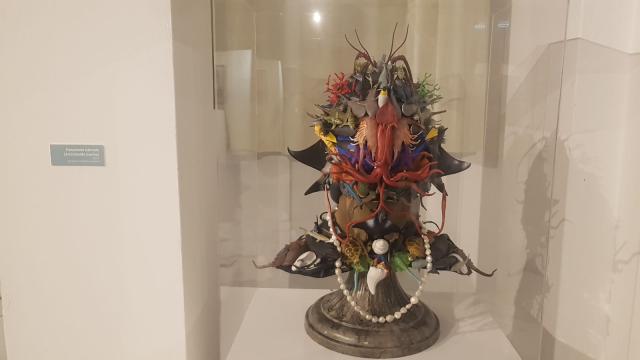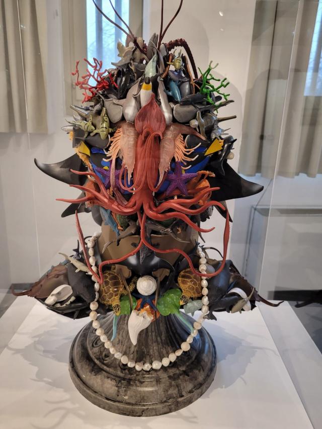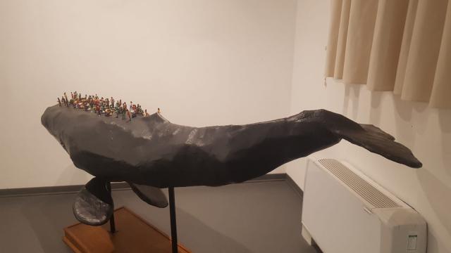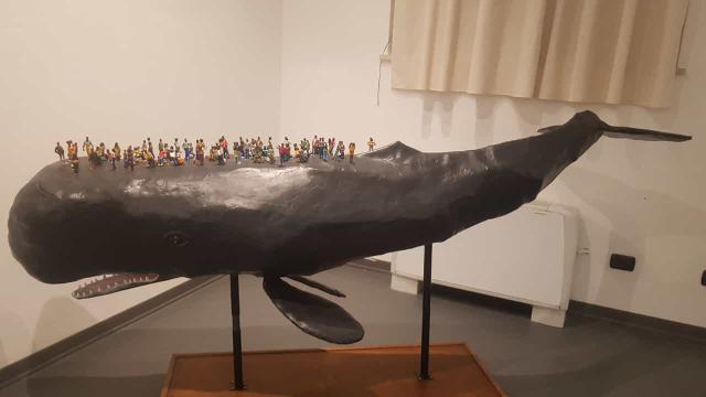 Nel medesimo ambiente compare Nuovi Arrivi, un grande lavoro di quasi tre metri realizzato nel 2021 con un modello di capodoglio che trasporta sul dorso una moltitudine di migranti. Attraverso la trasfigurazione del mito del salvataggio, l’artista s’ispira alle antiche favole polinesiane e hawaiane in cui i vivi si spostano sul dorso di un cetaceo. Anche in questa circostanza i riferimenti sono molti e la citazione più esplicita è a La Navigazione di San Brandano e alla balena-isola su cui, secondo la leggenda, sarebbe sbarcato il monaco irlandese.