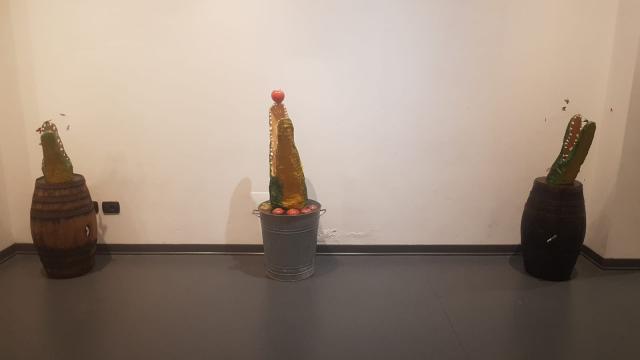 Ad accogliere lo spettatore il Ventre della balena l’inedita installazione site specific realizzata dall’artista per l’occasione con le vertebre e le costole del cetaceo in polistirolo. All'interno una candela sistemata su una sediolina con l'immagine di Pinocchio.
