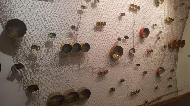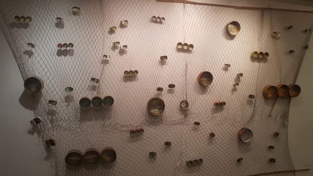 Le reti da pesca diventano lo spazio metaforico dove finiscono impigliate le scatolette di Mare, il ciclo iniziato nel 1987. L’artista mette in scena la sua personale archiviazione dei pesci che vengono dipinti su contenitori circolari per la conserva sottolio. Ne emerge un’installazione ecosostenibile in continuo divenire dove su ogni scatoletta di tonno compare un differente animale acquatico dando vita a un viaggio tra le creature marine in un’efficace rappresentazione del mondo subacqueo.