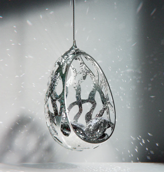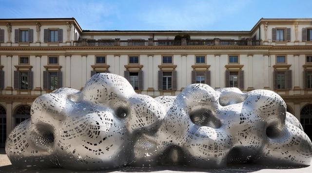 Si gira l’angolo, cortile delle carrozze di Palazzo Serbelloni, altra meraviglia l’ imponete installazione metallizzata riflette l’architettura del cortile, il tempo di un selfie e si sale al secondo piano per la celebrazione di Nomad Object. Nei saloni affrescati continua il gioco di specchi di sedie, tavoli, origami, debutto nel 2012, la collezione Louis Vuitton Objets Nomades, composta da mobili e oggetti creativi e funzionali, chandelier, una scultura di pelle e luce alta 1,2 metri, è composta da 36 cinghie bicolori in torsione per un totale di 145 metri di lunghezza, che creano volume e prendono forma grazie a cerchi di metallo color champagne. Quetzal è un grande oggetto decorativo, elegante espressione dell'idea del volo grazie al suo piumaggio composto da vivaci lembi di pelle. La lampada di vetro smerigliato intervallati da una serie di "piume" di pelle bicolore. Il design delle sedute Binga é ispirato alle linee curve di una pallina da tennis, accentuata dalla brillantezza della pelle lucida . La lampada Flower Tower dell'Atelier Biagetti è una colonna di 15 bolle di vetro a forma di fiore, scintillante, Basket Table dei designer italiani Zanellato/Bortotto ha tre fasce orizzontali di pelle intrecciate in una base metallica a nido d'ape, dominato da un piano in pietra lavica smaltata e riflettente.. I nuovi Bookend in marmo e alluminio sono realizzati in modo da poter essere combiniati tra loro. Infine, l’ormai celebre seduta Cocoon di Campana sarà presentata in una nuovissima edizione Disco Ball, rivestita con un sorprendente mosaico argentato.