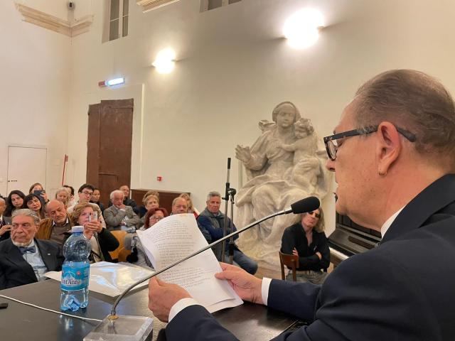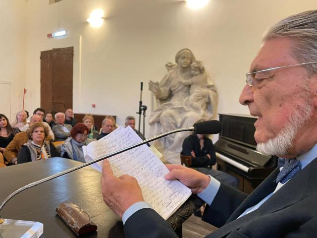 Tanti i momenti toccanti della serata, accompagnati dal pianoforte, come quando la sala gremita si è alzata in piedi, per ricordare che nel tempio di Nauplia sono iscritti i nomi di 266 filelleni morti, come Byron, per la redenzione della Grecia, di cui 42 italiani.