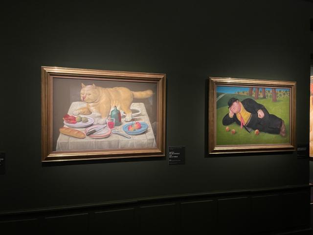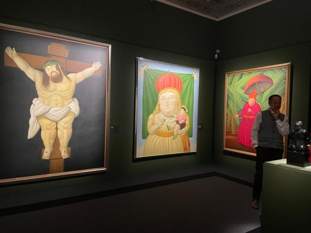 Presenti versioni di vari capolavori della storia dell’arte, come la Fornarina di Raffaello, il celebre dittico dei Montefeltro di Piero della Francesca, i ritratti borghesi di Rubens e van Eyck. Tornano i temi classici del circo e della corrida, mentre una sala è dedicata alla più recente sperimentazione del maestro che, dal 2019, dipingeva con acquerelli su tela.