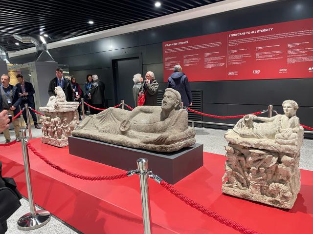Grazie alla collaborazione fra Aeroporti di Roma, Direzione Generale Musei ed il Museo Nazionale Etrusco di Villa Giulia, è stato possibile far “atterrare” nello scalo le opere, tra le piùsignificative della cultura etrusca, selezionate dai curatori del Museo, per offrire al pubblico la suggestione del fascino di questo antico popolo, oltre a dare un’opportunità per programmare una visita al Museo. Si tratta di due urne cinerarie in travertino provenienti da Perugia e di un coperchio di sarcofago da Tuscania, che catturano l’attenzione grazie ai ritratti idealizzati di Laris Afle, Arnth Acsi e Larth Cales, uomini, probabilmente aristocratici, vissuti nel II secolo a.C. Tutti e tre i personaggi sono raffigurati sdraiati, mentre partecipano a un simposio: un ricevimento in cui si beveva, conversava ed ascoltava musica, un momento fondante della vita sociale degli Etruschi.