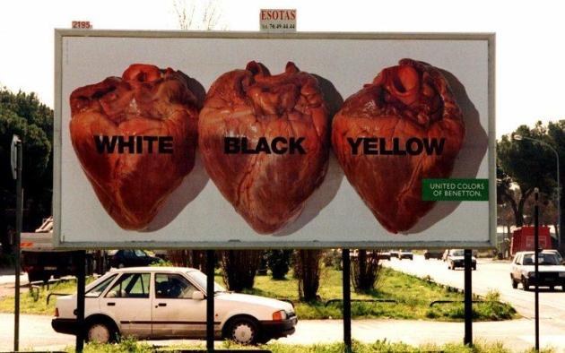 Tra le foto più famose di Oliviero Toscani, se non la più famosa, c'è quella che raffigura tre cuori, datata 1996. Ogni cuore ha una scritta: white, black e yellow. Sono i cuori veri di un bianco, di un nero e di un uomo giallo. Una foto pensata per la lotta al razzismo, perché per Toscani siamo tutti uguali, a prescindere dal colore della pelle.