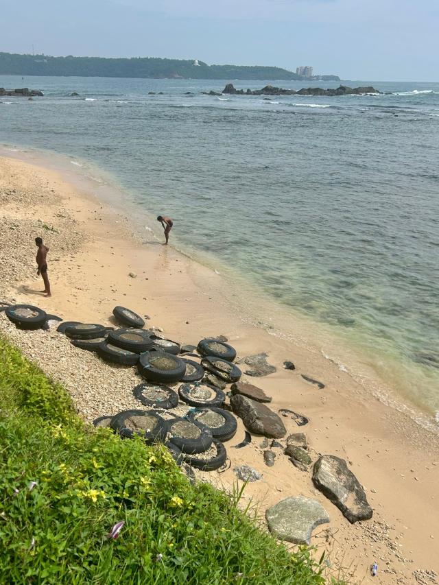 Sulla spiaggia troneggia un cumulo di copertoni. Il museo è chiuso per restauri.