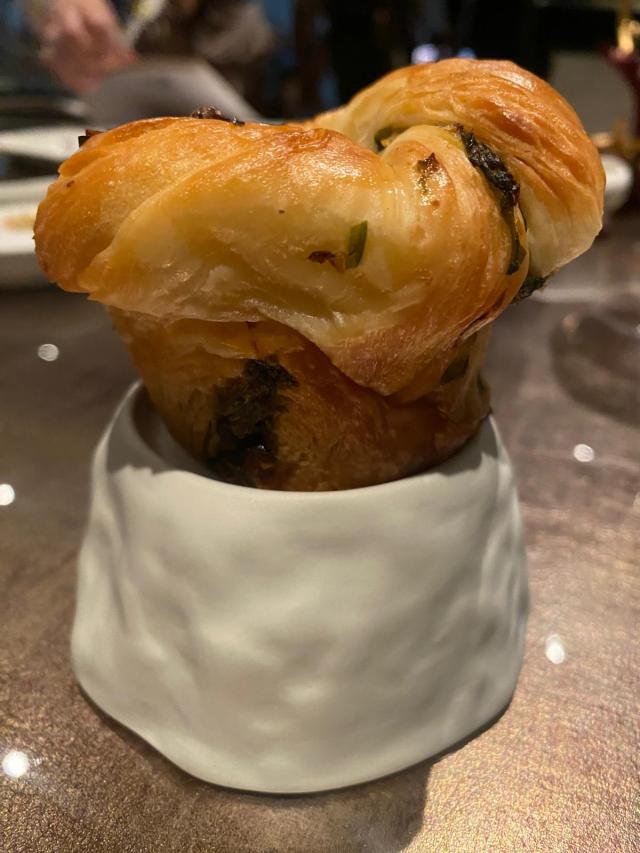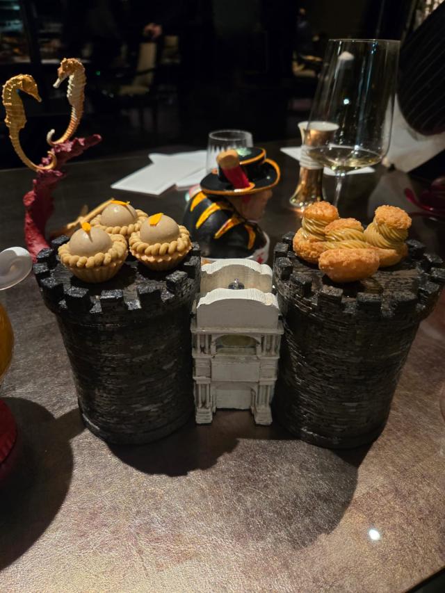 Arriva il trionfo di patisserie: 30 grammi di babà, chocolat a forma di cornetto, amuse en bouche al pistacchio con foglia d’oro…