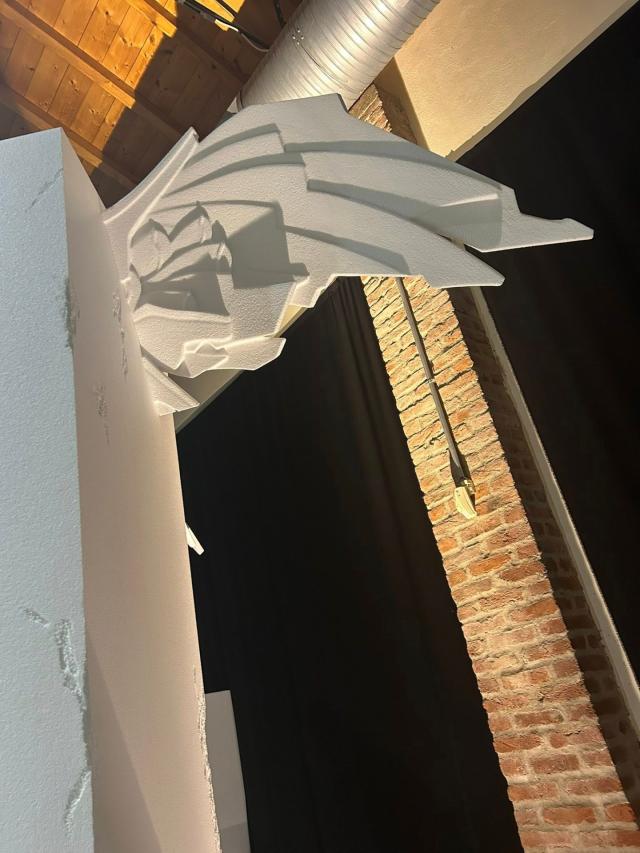 Si tratta di un’installazione monumentale che reinterpreta il mito classico di Amore (CUPIDO) e Psiche, trasformandolo in una scena in bilico tra umano e artificiale.