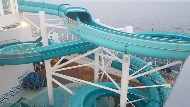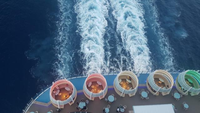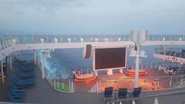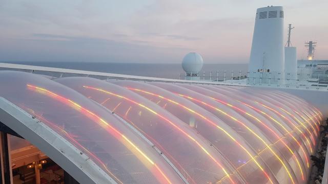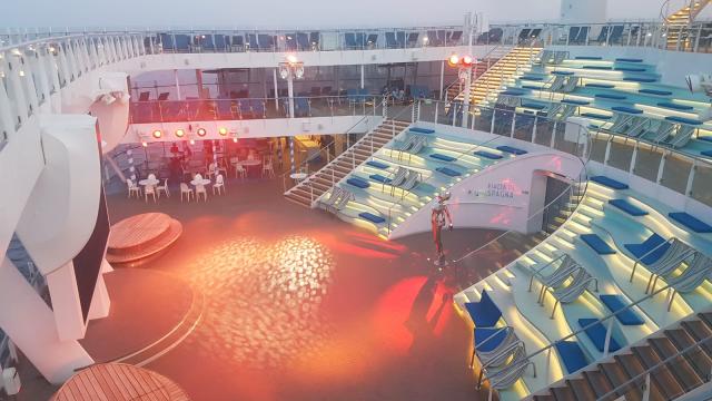 Dalla colorata città ligure, saliamo a bordo della nave dopo un attento iter di sicurezza; approdiamo nella hall e ci sentiamo subito catapultati in un mondo nuovo. Tutto intorno un cosmo variopinto dove tantissime sono le lingue e i volti che si susseguono ma dove vige un’identità e un sentimento profondo che affonda le sue radici nella scoperta, nel viaggio. Ci sentiamo subito parte di questa piccola ‘Atlantide’, temporanei cittadini ‘sospesi’ tra terra e mare per lo spazio di un viaggio.