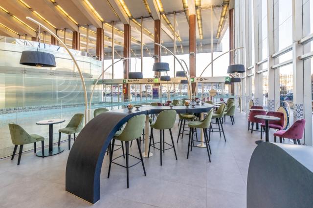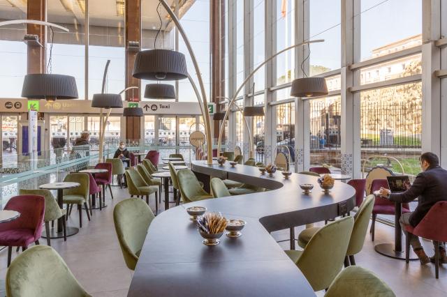 Materiali, forme e colori sono stati scelti in linea con la sostenibilità per minimizzare l’impatto ambientale e visivo. Tutti gli arredi, ad esempio, sono realizzati con legnami e materiali certificati e riciclabili, completamente disassemblabili e riutilizzabili. L’illuminazione è ad alta efficienza energetica e tutti i materiali sono coerenti con lo stile e i materiali di Termini, travertino in primis. Per il pavimento è stata scelta una ceramica bioattiva certificata ed ecocompatibile, con caratteristiche antibatteriche e autopulenti. C'è rispetto verso la natura e l’ambiente anche nella scelta delle miscele di caffè, i caffè Mogi, coltivati da cooperative locali e prevalentemente a gestione femminile in piantagioni organiche e sostenibili.