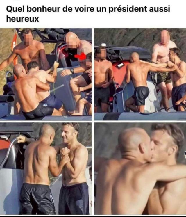 E' diventato virale un collage di foto che ha per protagonista il presidente francese, Emmanuel Macron, insieme ad un gruppo di uomini in barca. In uno degli scatti Macron bacia sulla bocca uno di loro, mentre in un'altra foto viene abbracciato da dietro.