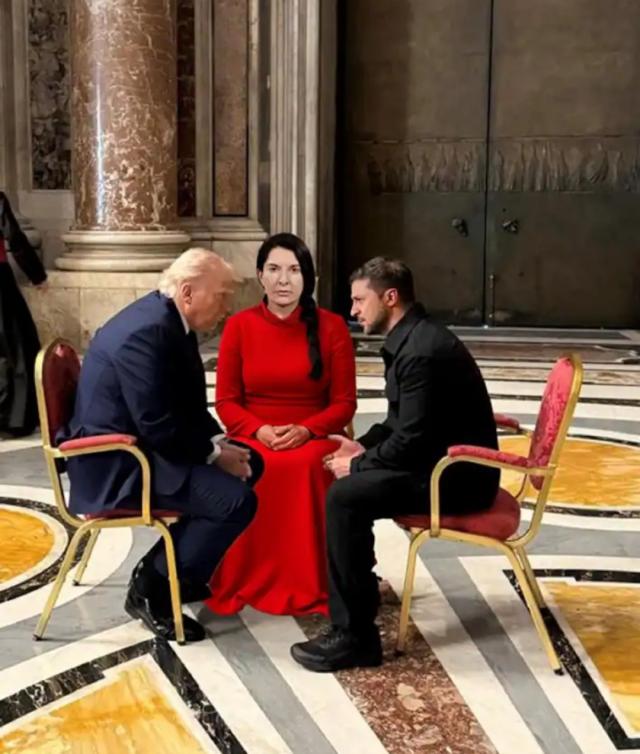 In un altro fotomontaggio l’incontro tra Trump e Zelensky si è trasformato in una performance di Marina Abramović.
