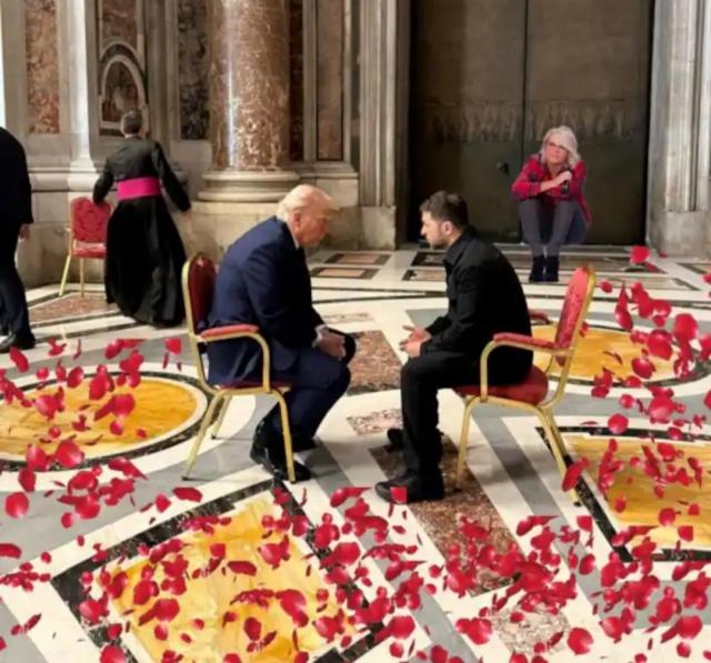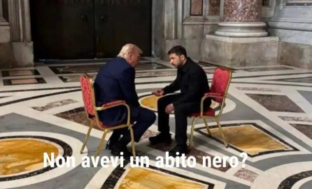 La foto dell’incontro tra il presidente degli Stati Uniti Donald Trump e il leader ucraino Volodymyr Zelensky, seduti faccia a faccia nella basilica di San Pietro prima dei funerali di Papa Francesco, ha fatto il giro del mondo e qualcuno l’ha utilizzata per creare divertenti meme e vignette.
