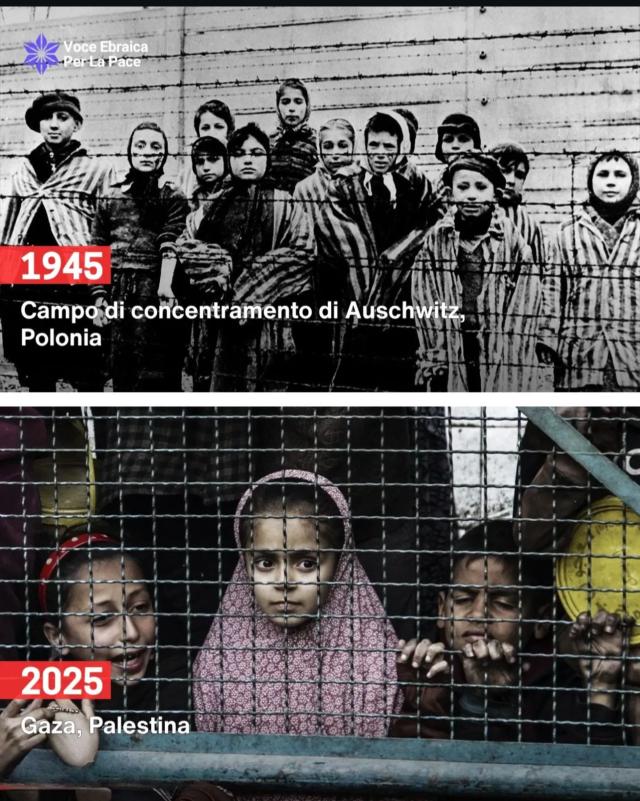 E poi vengono messe a confronto le situazioni in cui versa ora il popolo palestinese a Gaza e in Cisgiordania e gli ebrei negli anni '40. Nelle foto pubblicate si vedono gli ebrei stipati nelle baracche del campo di concentramento di Buchenwald e dietro al filo spinato di Auschwitz, come oggi i palestinesi sono costretti ai rifugi continuamente bombardati nella Striscia e alle prigioni israeliane, senza possibilità di fuga.