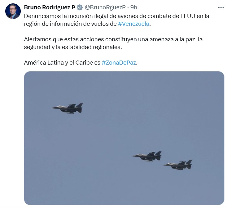 Il governo del Venezuela ha comunicato l'incursione "illegale" di caccia F-35 statunitensi in un'area sotto il controllo del traffico aereo venezuelano, condannando quella che ha definito una "posizione sconsiderata, avventuriera e guerrafondaia" da parte della "minaccia" americana.