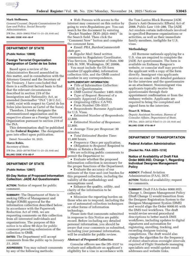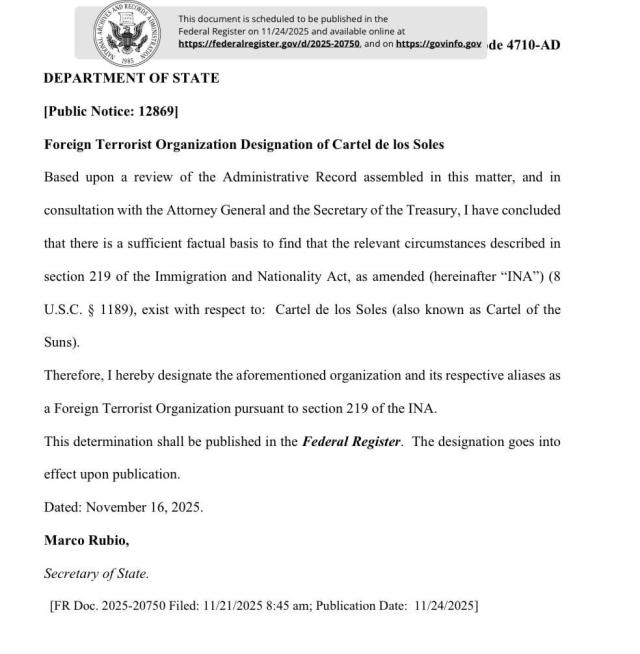 Il cosiddetto Cartello dei Soli (Cartel de los Soles), gruppo di criminali narcotrafficanti considerato dagli Stati Uniti tra i principali responsabili del traffico illecito di droga, e "associato" al leader Nicolás Maduro, diventa oggi un'"Organizzazione Terroristica Straniera" (FTO).
