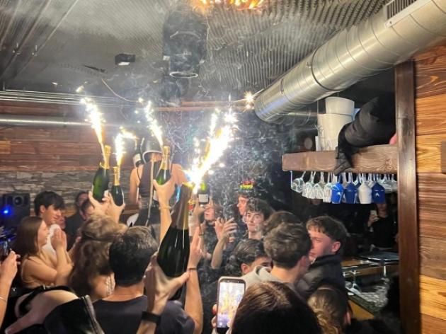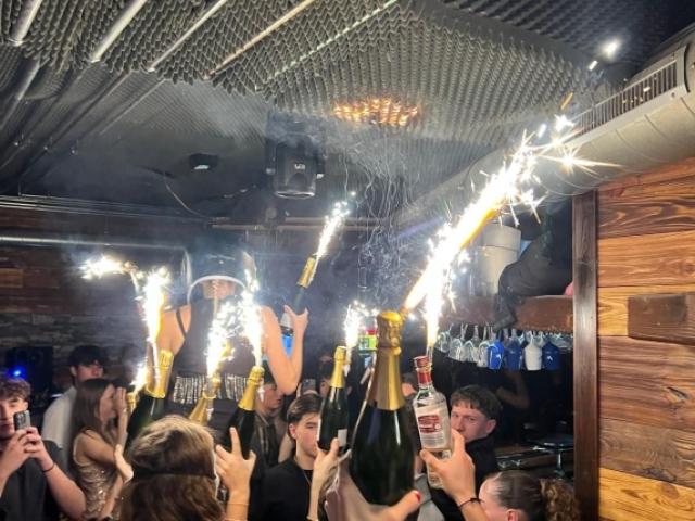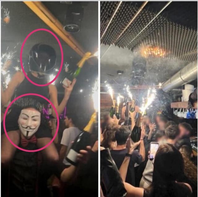 La ragazza con il casco è la più vicina al soffitto. È a cavalcioni sulle spalle di un ragazzo mascherato. Tiene entrambe le mani alzate e in ciascuna stringe una bottiglia di champagne con la candela pirotecnica accesa. Proprio quelle scintille, a contatto con i pannelli fonoassorbenti del soffitto, potrebbero aver innescato l’incendio.