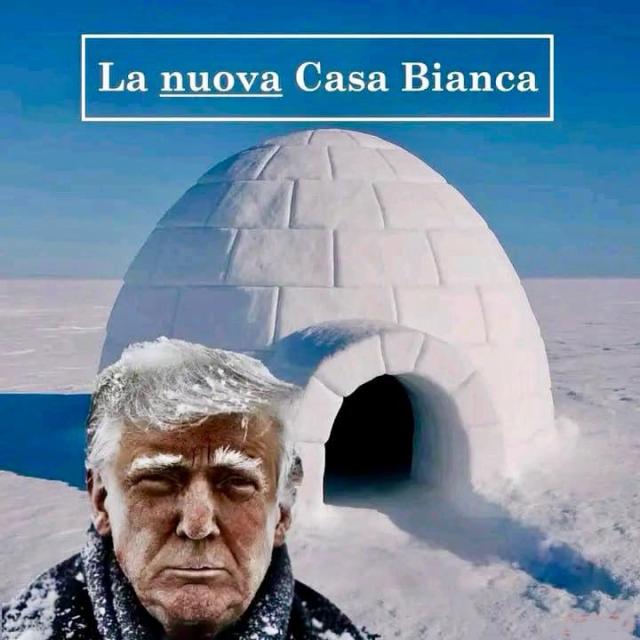 Un altro meme diventato virale sui social mostra invece Trump con la bocca sporca di neve e i capelli congelati davanti a un igloo, descritto come la “Nuova Casa Bianca”. Un’immagine che ironizza sulle condizioni climatiche estreme dell’isola artica e sull’ipotesi, più volte evocata negli anni e ormai concretizzata, di un interesse strategico statunitense per la Groenlandia, territorio autonomo ma sotto la sovranità danese.