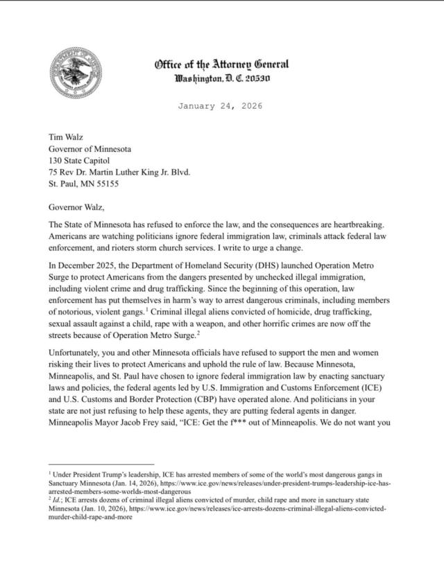"Lei e il suo ufficio dovete ristabilire il rispetto per la legge, supportare gli agenti dell'ICE, e porre fine al caos in Minnesota. Fortunatamente, ci sono soluzioni di buon senso a questi problemi che spero possiamo percorrere insieme". È questo uno dei passaggi-chiave della lettera controversa inviata sabato 24 Gennaio dalla Procuratrice Usa Pam Bondi al governatore dello Stato del Minnesota Tim Walz. Esattamente poche ore dopo l'esecuzione dell'infermiere 37enne Alex Jeffrey Pretti.