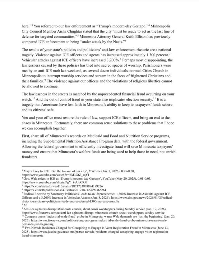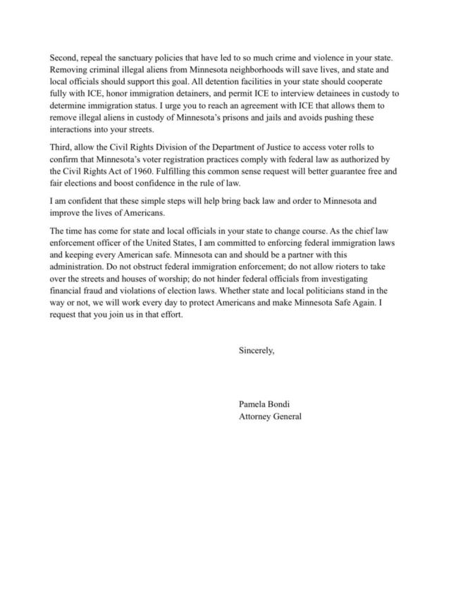 Seconda soluzione: "Abrogare le 'sanctuary policies' [linee guida che limitano la cooperazione tra agenti statali e forze federali in materia di immigrazione, ndr] (...). Tutte le strutture di detenzione del vostro Stato dovrebbero cooperare pienamente con l’ICE, rispettare i fermi per immigrazione e consentire all’ICE di interrogare i detenuti in custodia per determinare il loro status di immigrazione". Ma soprattutto, terza: "permettere alla Divisione dei Diritti Civili del Dipartimento Giustizia di accedere ai registri elettorali per confermare che le pratiche di registrazione degli elettori del Minnesota si conformino alla legge federale come autorizzato dal Civil Rights Act del 1960".
