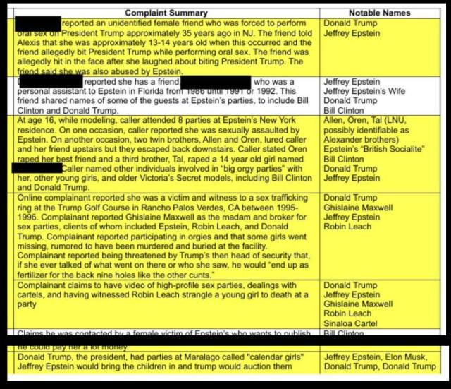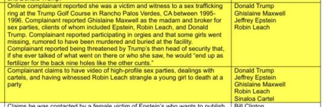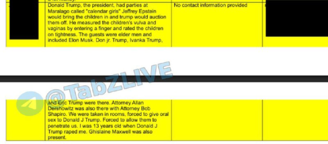 Il Presidente degli Stati Uniti Donald Trump avrebbe organizzato "parties", presso la sua villa a Mar-a-Lago in Florida, chiamati "Calendar Girls" ("ragazza da calendario") durante i quali "metteva all'asta le bambine che Jeffrey Epstein forniva" e autorizzava che venissero misurate loro vulva e vagina valutandone lo stato di tensione".