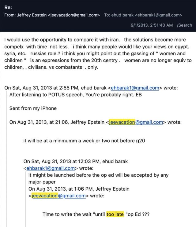 Un messaggio a cui risponde proprio Priel ritrasmettendo la mail e scrivendo "[Barak, ndr] sarà sulla CNN - è stato appena intervistato, non so quando la pubblicheranno". Questo scambio di battute assoda ulteriormente le conoscenze politiche di Epstein nel mondo israeliano, che si sarebbero spinte al punto da permettergli di discorrere con lo stesso Barak di regioni come la Siria, l'Iran, il Libano e l'Ucraina. Questi ultimi dettagli sono invece emersi da alcuni documenti hackerati ben prima che il DOJ autorizzasse il rilascio dei file. In un messaggio pubblicato da Drop Site si legge curiosamente "Con l’esplosione dei disordini civili in Ucraina, Siria, Somalia, Libia e con la disperazione di chi è al potere, non è forse perfetto per te?" scrive Epstein. Questa la risposta di Barak: "Hai ragione in un certo senso. Ma non è semplice trasformarlo in un flusso di cassa. Un argomento per sabato".