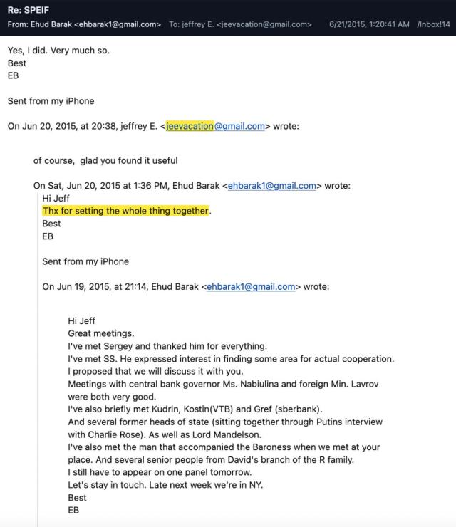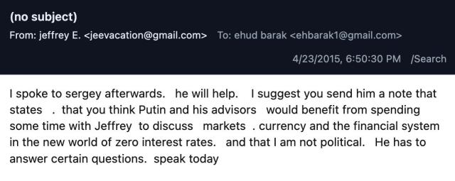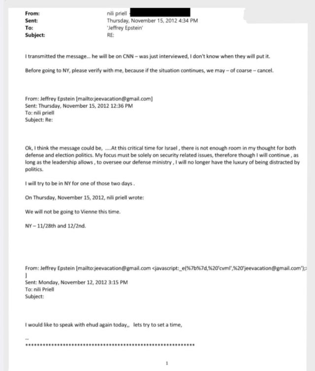 Una mail in particolare confermerebbe le speculazioni. Una mail datata Novembre 2012 nella quale Epstein avrebbe mandato a Nili Priel, seconda moglie dell'ex primo ministro Ehud Barak, la bozza di un discorso che inizia come segue: "In questo momento critico per Israele, non c'è abbastanza spazio nei pensieri tanto per la difesa quanto per la politica elettorale. Il mio focus deve essere esclusivamente sulle questioni legate alla sicurezza; pertanto, pur continuando — finché la leadership lo consentirà — a supervisionare il nostro Ministero della Difesa, non avrò più il lusso di lasciarmi distrarre dalla politica".