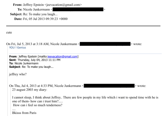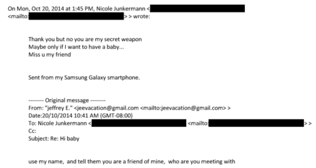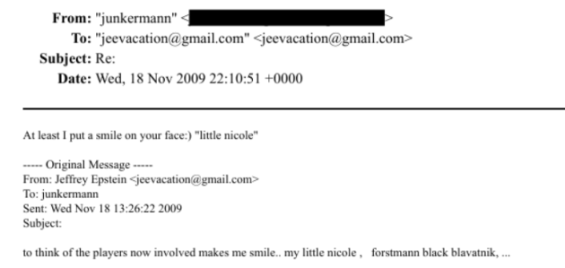 I documenti parlano e suggeriscono incontri, favori, regali, legami stretti in cui la contessa si rivolgeva ad Epstein con l'appellativo "baby" e quest'ultimo le scriveva "la mia piccola Nicole" (e-mail del 18 Novembre 2009). Altrove, un'ulteriore e-mail personale dell'imprenditrice tedesca datata Luglio 2013 recita: "Non riesco a dormire, penso a Jeffrey.. Ci sono poche persone nella mia vita con cui voglio passare del tempo, lui è uno di loro- Come posso fidarmi di lui?..... Come posso sentire tanta tenerezza?... Baci da Parigi". La più controversa però resta una e-mail di Giugno 2010 nella quale Junkermann avrebbe scritto ad un soggetto omesso dal DOJ "Vuoi avere un bambino con me? Qual è il posto migliore per farlo?".