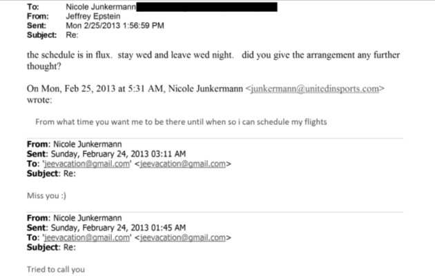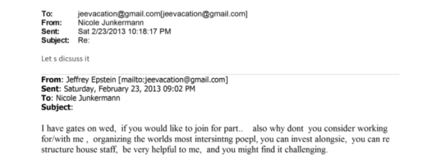 Le conversazioni tra la contessa tedesca ed Epstein, che in un'occorrenza certa lei chiama "Mr Wonderful", sembrerebbero far affiorare toni d'intesa e sicurezza. I primi significativi carteggi pubblicati risalirebbero già al 2009 quando Junkermann suggeriva di fare visita al finanziere dopo che quest'ultimo aveva scontato i 13 mesi di carcere. In una e-mail del 10 Dicembre 2009 Junkermann scriveva "Are you awake baby?". Altri messaggi sembrano suggerire come Epstein avrebbe dato consigli, proposto "offerte di lavoro" e introdotto verosimilmente la contessa in cerchie d'élite con personaggi famosi (e-mail di Febbraio 2013) tra cui Bill Gates. Nicole Junkermann, a quell'altezza cronologica, era già nota al pubblico come modella, con un curriculum di rispetto in campo amministrativo e di gestione aziendale, oltre che acquirente della società di marketing Infront Sports & Media nel 2002 con l'allora partner Robert Louis-Dreyfus.