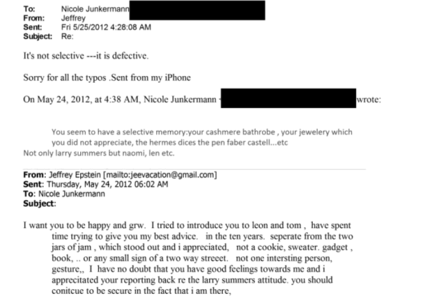 Poi la conversazione prosegue con la risposta di Junkermann ad Epstein (i documenti oscurano il destinatario, ma in una e-mail successiva l'ex finanziere sembra rispondere proprio all'osservazione della contessa). "Mi sembri avere una memoria selettiva", e prosegue discorrendo di un "accappatoio in cashmere", "gioielli che non apprezzasti", "i dadi Hermes", "la penna Faber Castell ecc".