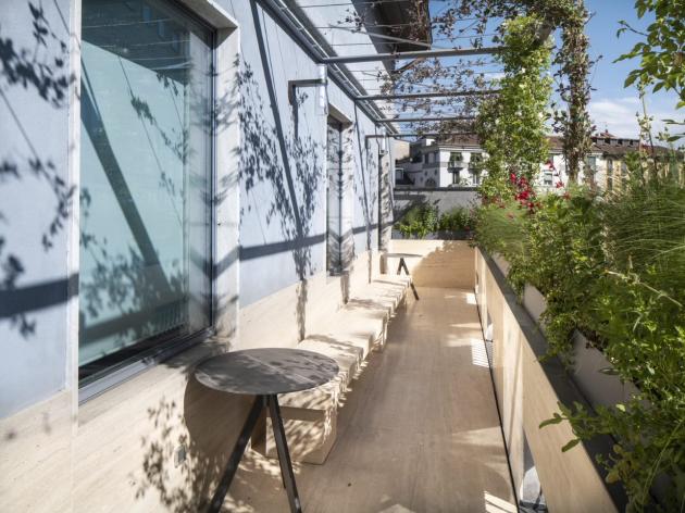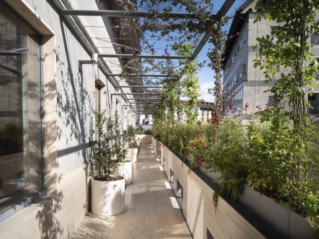 Rimanendo in tema verde la sede ospita al quarto piano una terrazza ricoperta da rampicanti, una scala esterna mitigata da vegetazione e i garage coperti da vasche verdi arricchite con piante ed essenze.