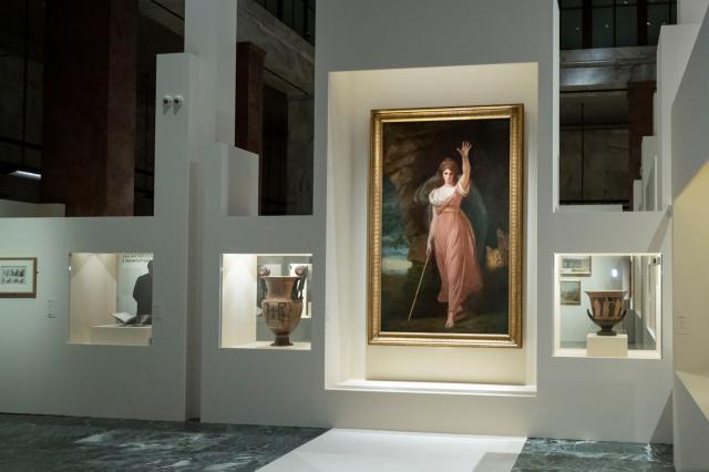 Una parte consistente dell’esposizione è dedicata alla figura di Lady Hamilton. Dopo la scomparsa nel 1782 della prima moglie, Hamilton divenne un protagonista della mondanità più esclusiva grazie al secondo matrimonio con Emily Lyon, più nota come Emma Hart (Neston, 1765 – Calais, 1815), la celebre avventuriera che ebbe una grande influenza anche a livello politico per i suoi legami con la regina Maria Carolina e per la scandalosa relazione con il celebre ammiraglio Horatio Nelson. I magnifici ritratti in mostra dell’inglese George Romney e del tedesco Johann Heinrich Wilhelm Tischbein restituiscono il fascino di Emma, che fu rappresentata anche da altri pittori dell’epoca nelle vesti di figure della classicità e del mito. Venne così alimentata l’immagine di una donna destinata a entrare nella leggenda per la sua smagliante bellezza, per il suo spirito e per la spregiudicata libertà dei suoi costumi. Divenne poi celebre per le sue “attitudini”, ovvero le suggestive pose che assumeva rappresentando per i suoi ospiti dei tableaux vivants dove evocava le divinità e le eroine del mondo classico.