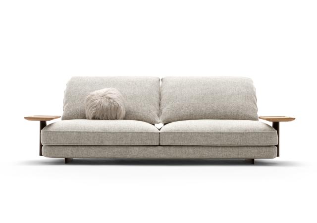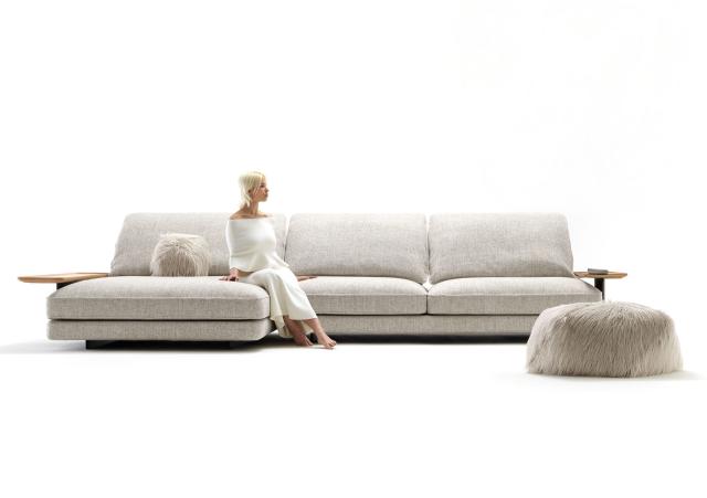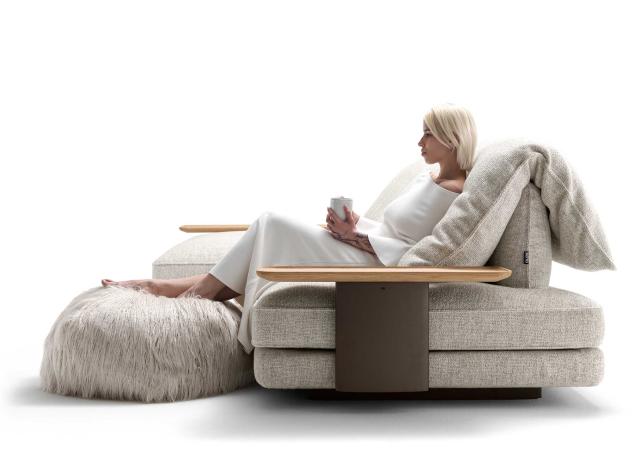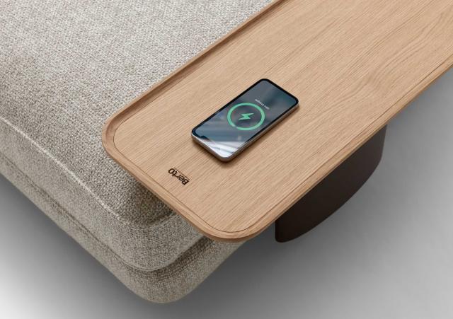 Il bracciolo di David si distingue come elemento versatile e personalizzabile, progettato per adattarsi alle diverse esigenze dell’abitare contemporaneo. Può essere scelto con un morbido cuscino in piuma, che offre un appoggio avvolgente e accogliente, oppure con un elegante vassoio in rovere naturale, pensato come piano d’appoggio funzionale per oggetti e accessori. A completare la praticità del divano, due porte USB-C integrate direttamente nelle basi dei braccioli che consentono di ricaricare dispositivi sempre a portata di mano, mentre la versione con bracciolo vassoio in rovere naturale aggiunge un caricatore wireless discreto ed elegante, unendo design e funzionalità in un dettaglio esclusivo.