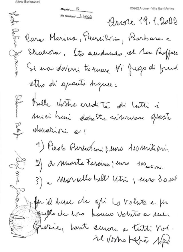 Il secondo documento, consegnato da Fascina, descrive il momento in cui la deputata "alla presenza dei testimoni mi consegna una busta non sigillata recante la scritta 'ai miei figli' e la firma 'S.Berlusconi', contenente un foglio di carta intestata composto da due facciate scritte con inchiostro nero, apparentemente da un'unica persona... che ritiene essere il testamento olografo del signor Silvio Berlusconi e che mi chiede di pubblicare". Questa lettera, datata 19 gennaio 2022, contiene ulteriori disposizioni testamentarie, tra cui il lascito di 100 milioni di euro per Marta Fascina e di 30 milioni di euro per Marcello Dell'Utri.