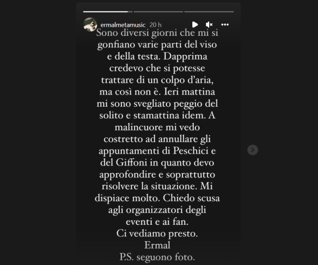 "A malincuore mi vedo costretto ad annullare gli appuntamenti di Peschici e del Giffoni in quanto devo approfondire e soprattutto risolvere questa situazione. Mi dispiace molto. Chiedo scusa agli organizzatori degli eventi e ai fan. Ci vediamo presto". Con questo messaggio Ermal Meta ha annunciato la cancellazione di alcuni concerti per problemi di salute.