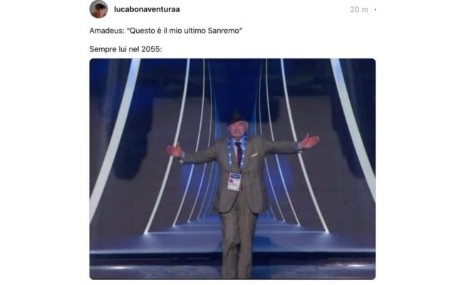 Preso di mira anche Amadeus: "Questo sarà il mio ultimo Festival", e una foto di Ruggiero Del Vecchio, un pensionato di 83 anni. "Sempre lui nel 2055". E poi meme sui La Sad per la loro acconciatura, addirittura uno di loro sarebbe "figlio di Kmer". Ce ne sono a bizzeffe su Big Mama, ancora Amadeus a causa dello sketch del "preserbacino" inventato da Mengoni, Il Volo, Irama e tutti gli altri cantanti in gara.