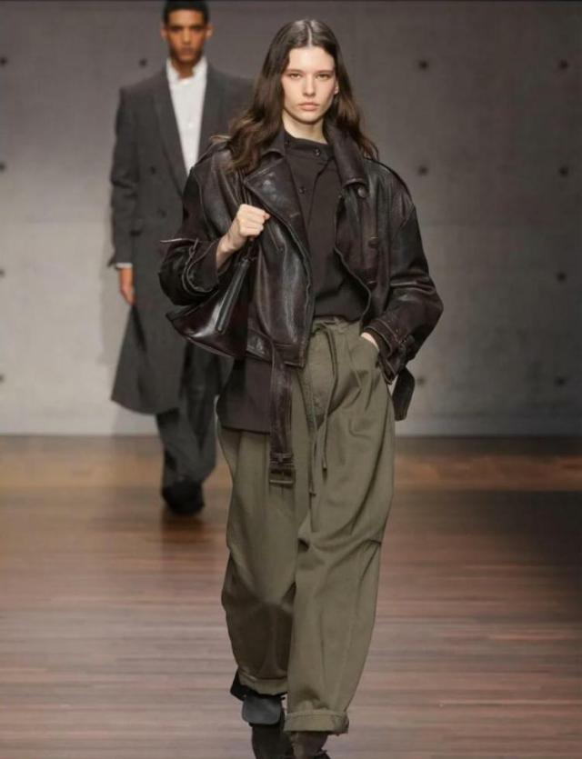Spalle morbide, lunghezze sotto il ginocchio e volumi continui disegnano una figura urbana e composta, mentre i cappotti in lana con colli ampi e chiusure decentrate rileggono la tradizione sartoriale in chiave fluida. Il gessato soft, i jacquard geometrici e le gonne diritte introducono un ritmo grafico e silenzioso. Un must to have gli stivali in pelliccia eco.