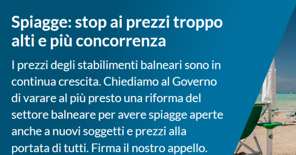 L'associazione ricorda come "in contrasto con la direttiva europea che da anni chiede all'Italia una liberalizzazione del settore, a febbraio 2023 il Governo aveva dato la possibilità ai Comuni di estendere le concessioni balneari attualmente in vigore fino al 2024 senza alcun bando di assegnazione. Ma, secondo una recente sentenza del Consiglio di Stato, la proroga per tutto il 2024 delle attuali concessioni balneari per lo sfruttamento economico di spiagge e lidi è illegittima ed occorre quindi mettere a piano al più presto nuovi bandi di assegnazione, anche perché oggi i rincari delle spiagge (in mano sempre agli stessi gestori) ricadono sui consumatori".