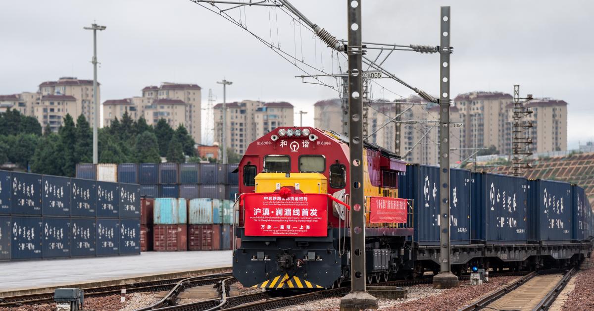 (XINHUA) - KUNMING, 8 OTT - Il primo treno merci dell'Espresso Shanghai-Kunming Lancang-Mekong parte dalla Wangjiaying West Station a Kunming, nella provincia cinese sud-occidentale dello Yunnan, l'8 ottobre 2023. Un treno carico di merci dall'Asia sud-orientale e di prodotti tipici dello Yunnan è partito oggi da Kunming, e il suo arrivo a destinazione a Shanghai è previsto in 82 ore. La partenza ha segnato il lancio ufficiale del servizio di treno merci Espresso Shanghai-Kunming Lancang-Mekong, che percorre la Ferrovia Cina-Laos e la Ferrovia Shanghai-Kunming per collegare la capitale laotiana di Vientiane e Shanghai nell'est della Cina. (XINHUA)