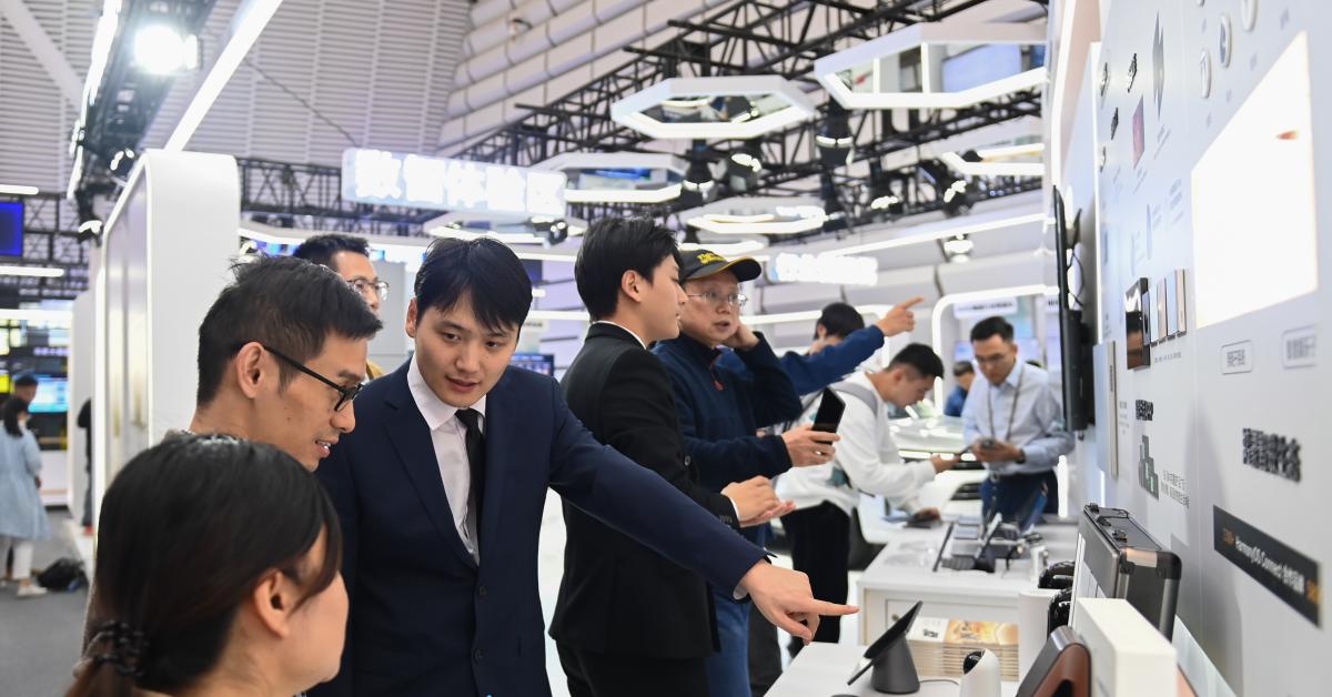 (XINHUA) - TONGXIANG, 8 NOV - Visitatori apprendono informazioni sul sistema domestico smart presso lo stand di Huawei durante la Light of Internet Expo a Wuzhen, nella provincia orientale cinese dello Zhejiang, ieri 7 novembre 2023. La fiera ha preso il via ieri nella città, con diverse zone espositive a tema, come l'intelligenza artificiale e la tecnologia digitale, e con zone espositive caratteristiche, come l'area espositiva estera. (XINHUA)