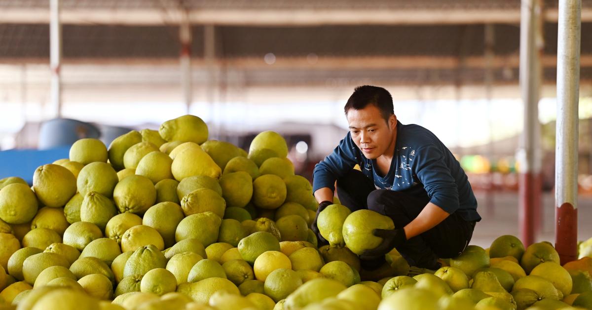 (XINHUA) - LUOCHENG, 21 NOV - Un abitante del villaggio sistema i pomeli in un'area dimostrativa dell'industria ecologica nella contea autonoma Mulao di Luocheng, nella regione autonoma meridionale cinese del Guangxi Zhuang, oggi 21 novembre 2023. I pomeli dell'area dimostrativa di recente sono entrati nella stagione del raccolto a Luocheng. (XINHUA)
