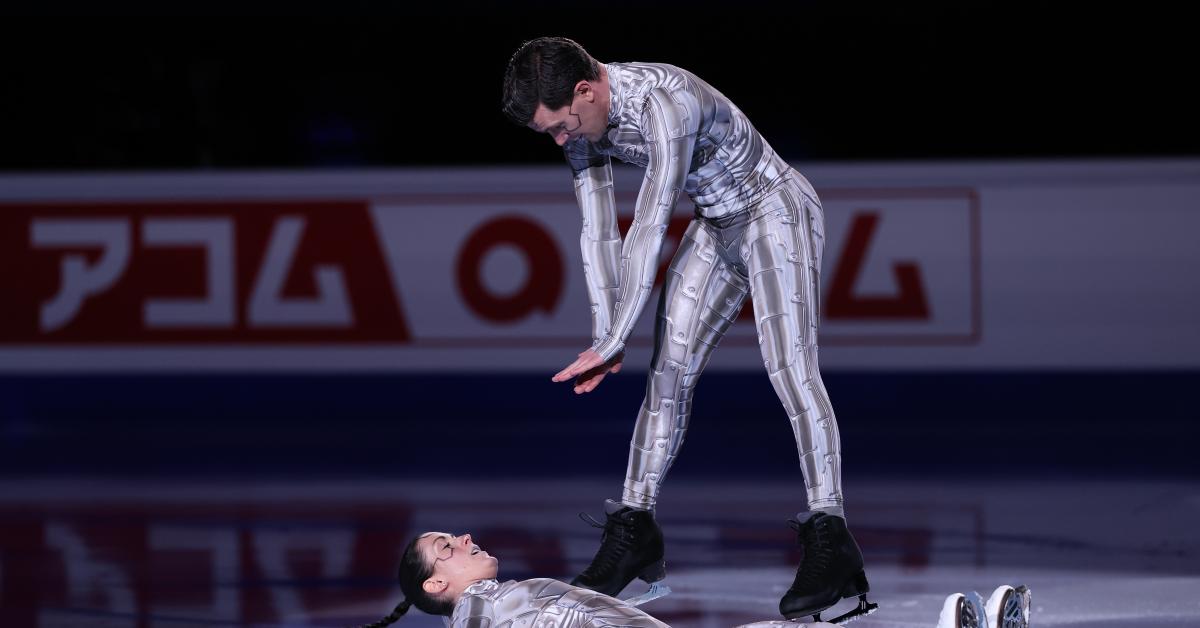 (XINHUA) - PECHINO, 10 DIC - Charlene Guignard (sotto) e Marco Fabbri dall'Italia si esibiscono durante il banchetto di chiusura alla Finale del Grand Prix ISU di pattinaggio di figura 2023 a Pechino, in Cina, il 10 dicembre 2023. (XINHUA)
