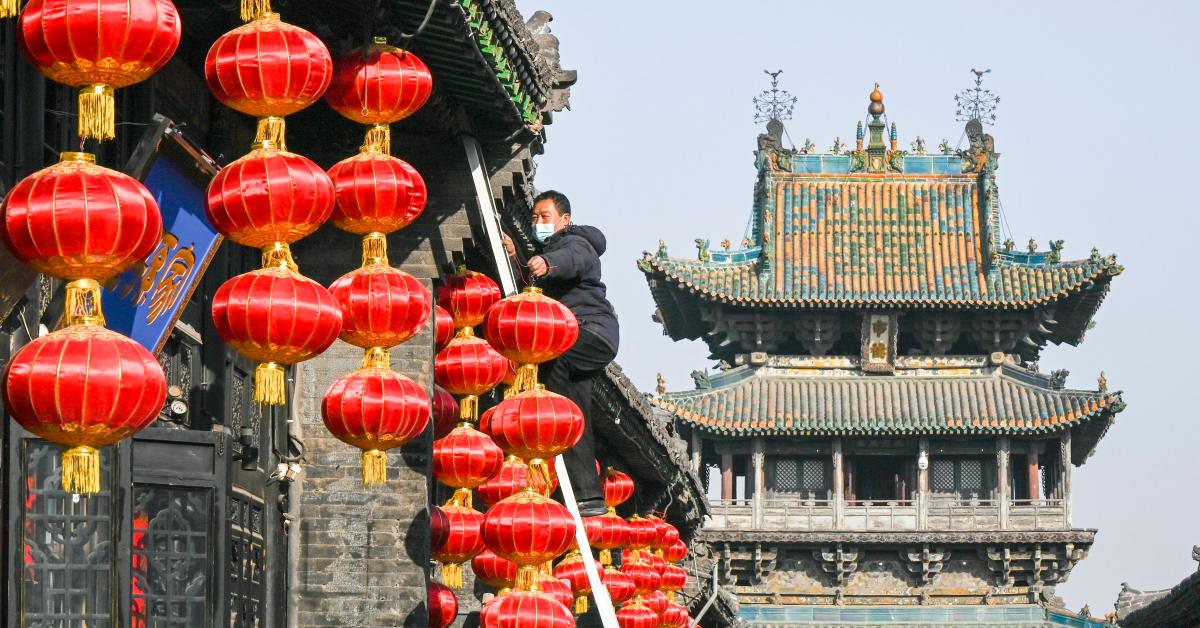 (XINHUA) - PECHINO, 30 GEN - Un uomo appende lanterne rosse per accogliere il Capodanno lunare cinese nell'antica cittadina di Pingyao, nella provincia settentrionale cinese dello Shanxi, ieri 29 gennaio 2024. Con l'avvicinarsi della Festa di primavera, in tutto il Paese si vedono decorazioni festive. (XINHUA)