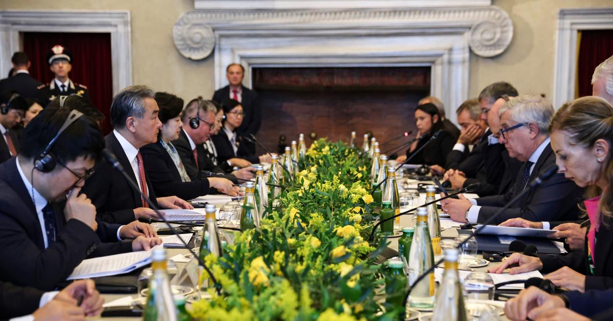 (XINHUA) - ROMA, 9 OTT - Il ministro cinese degli Esteri Wang Yi, anche membro dell'Ufficio politico del Comitato centrale del Partito comunista cinese, partecipa alla 12ma Riunione congiunta del Comitato governativo Cina-Italia con il vice presidente del Consiglio e ministro degli Affari Esteri e della Cooperazione Internazionale d'Italia Antonio Tajani a Roma, in Italia, ieri 8 ottobre 2025. (XINHUA)