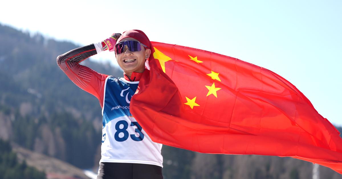 (XINHUA) - TESERO, 8 MAR - Il cinese Cai Jiayun festeggia dopo aver vinto la finale dello sprint maschile standing di para biathlon ai Giochi paralimpici invernali di Milano-Cortina 2026 a Tesero il 7 marzo 2026. (XINHUA)